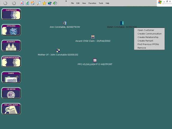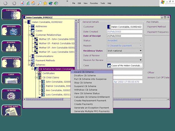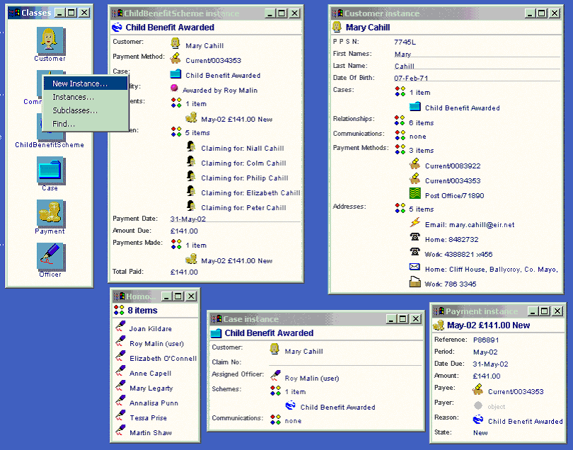 In addition to this positive reaction from the user representatives, the IS management were also impressed with speed of this exercise compared to previous attempts at department-wide modelling (whether as objects, data, or processes). They were only too familiar with the phrase 'analysis paralysis'. Although the DSFA was by no means ready to commit to this new approach for a full-scale implementation at that stage, all agreed that the concept should be explored in more depth. The Child Benefit systemAt the beginning of 2000 the business case for action became more urgent. The existing Child Benefit Administration system needed to be replaced with some urgency. The Government had indicated possible future changes to Child Benefit that the existing system could not be modified to address. Child Benefit is one of the simpler schemes that the DSFA administers and is relatively small in scale: the existing system had just 50 users. Yet it also has much in common with other schemes. It seemed an ideal opportunity to start the deployment of a new approach. In a series of workshops involving both senior managers and user representatives, the responsibilities outlined in the original object model (from the one-day workshop) were now fleshed out from the particular perspective of Child Benefit Administration. These ideas were immediately prototyped using a very early version of a prototyping tool designed by the authors. During the workshops, object responsibilities were refined and new responsibilities identified. New sub-classes and secondary (or 'aggregated') objects were also added. And the whole model was crudely tested against a number of business scenarios. Some screenshots from this prototype and an example use-case for processing a straightforward application for Child Benefit are shown on this page. Additionally, the model was crudely tested against a variety of scenarios of how the DSFA's business might change in future. What is remarkable is how well the initial model from the one-day workshop stood up to these subsequent demands and tests. Technology demonstratorsMeanwhile, another group was looking at how to translate these concepts into a working infrastructure that would fit in with the DSFA's technical requirements. As a public sector agency, all procurement is subject to the European Union tendering rules. Accordingly, the DSFA published an RFT (Request For Tender) for 'technology demonstrators' that would implement all the main layers of a scaleable enterprise architecture (including message broking, transaction monitoring, and persistence) using a relational database, whilst at the same time reflecting the design ethos of the prototype. The Department commissioned three such demonstrators, each using different object technologies: EJB, COM+, and a proprietary object-oriented package. Phase I implementationHaving evaluated the demonstrators, the DSFA put out a new RFT for the design and implementation of a full-scale 'Expressive Object Architecture' and the business functionality necessary to replace the existing Child Benefit Administration system. Interestingly, the RFT did not provide a full functional specification, but it did provide a description of the high-level responsibilities required of the core business objects, which is reproduced in this section. The contractor would be required to undertake a detailed requirements specification at the start of the project, using those object descriptions. This was deemed to be sufficient information for the contractors to place fixed-price bids. The contract was awarded in February 2001 to DMR Consulting (now known as Fujitsu Consulting) - with the original intent that the new system would go live in March 2002. Following some industrial relations issues to do with the business changes being introduced, the switchover was postponed until the summer of 2002. The user interface of the implemented Child Benefit system is not identical to that of the prototype shown earlier, but it clearly adheres to the same principles: business objects show directly through to the user interface, both as classes and instances, and all business actions are initiated either via pop-up menus from the objects or via drag-and-drop. Moreover, the entire user interface is auto-generated, dynamically, from the underlying business objects. Screenshots from the implemented system are shown on this page. Moving into Phase IIAt the beginning of 2002, when a substantial amount of the Phase I development had been completed but before it went live, the DSFA started to plan Phase II, to replace the current systems for administering the state pension schemes. This will use the Expressive Object Architecture built for Phase I, but is considerably larger in both scale and scope. At the very beginning of the original project in 1999, Richard Pawson advised the DSFA that re-use should not be treated as an objective. He recommended that the objective should be agility: strategic business agility, operational business agility, and agility in the development process. If these goals were pursued, and the object modelling was done well, then re-use would be a positive side effect. And so it proved. The preliminary object modelling for Phase II, conducted early in 2002, has shown levels of re-use from Phase I that have startled even the most passionate of the object-modellers. The message: re-use is a good result, and a poor objective.